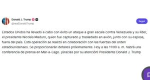“Estados Unidos ha llevado a cabo con éxito un ataque a gran escala contra Venezuela y su líder, el presidente Nicolás Maduro, fue capturado y trasladado en avión junto con su esposa, fuera del país”, escribió en un mensaje en su red Truth Social