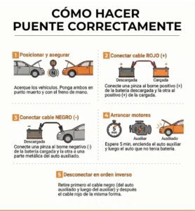 Pero si lo que ocurre es alguna de las dos fallas mencionados anteriormente, una vez detectado si es eléctrico o mecánico, hay cosas que se pueden hacer y otras que no son recomendables. Si no llega electricidad, es muy simple. O se llama a un auxilio mecánico o se intenta hacer un puente con otro auto. Para eso es necesario tener lo cables que conecten una batería con otra. Son dos cables, uno rojo y uno negro, que tienen una pinza el mismo color en cada extremo, gracias a los cuales una batería con carga puede darle electricidad a una descargada.